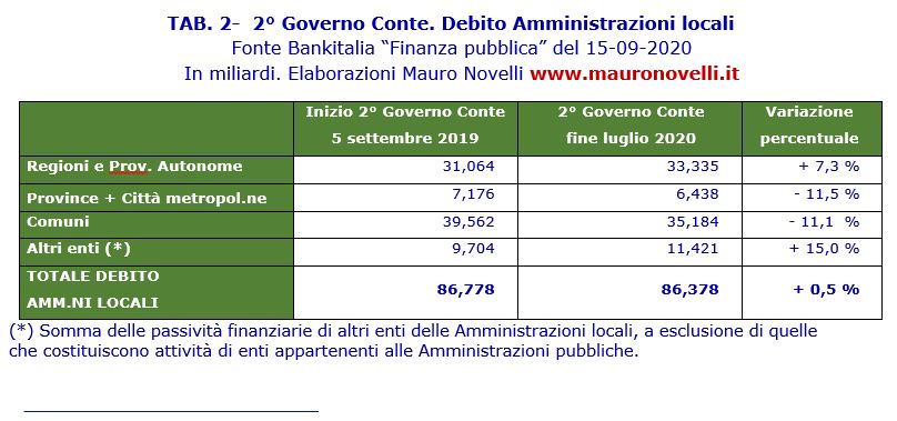 delle amministrazioni locali: da 86,778 miliardi del 1° settembre 2019 a 86,378 di fine luglio 2020 (- 0,5